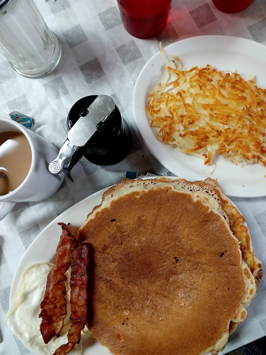 Our food was amazing, the portions were large. Our server, she was wonderful, had tons of knowledge about the area. We also had the local paper to read while we waited. Best friend ordered his hash browns, loaded. Peppers, onions, mushrooms, cheese, ham and tomato. That made his 12.99 breakfast 20.00. Thats why I didn't give it 5 stars. The coffee, is SUPER YUMMY!!! They also offer a salad bar for later in the day. We cannot wait to try that!! Oh we are going back for sure!