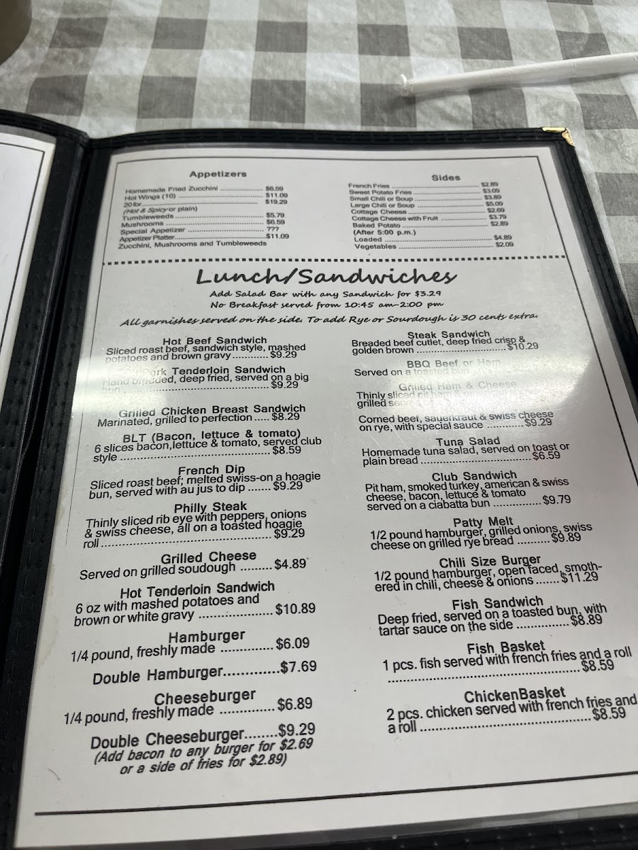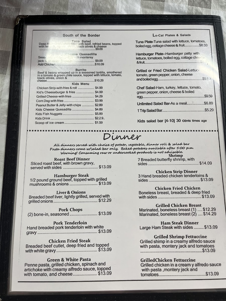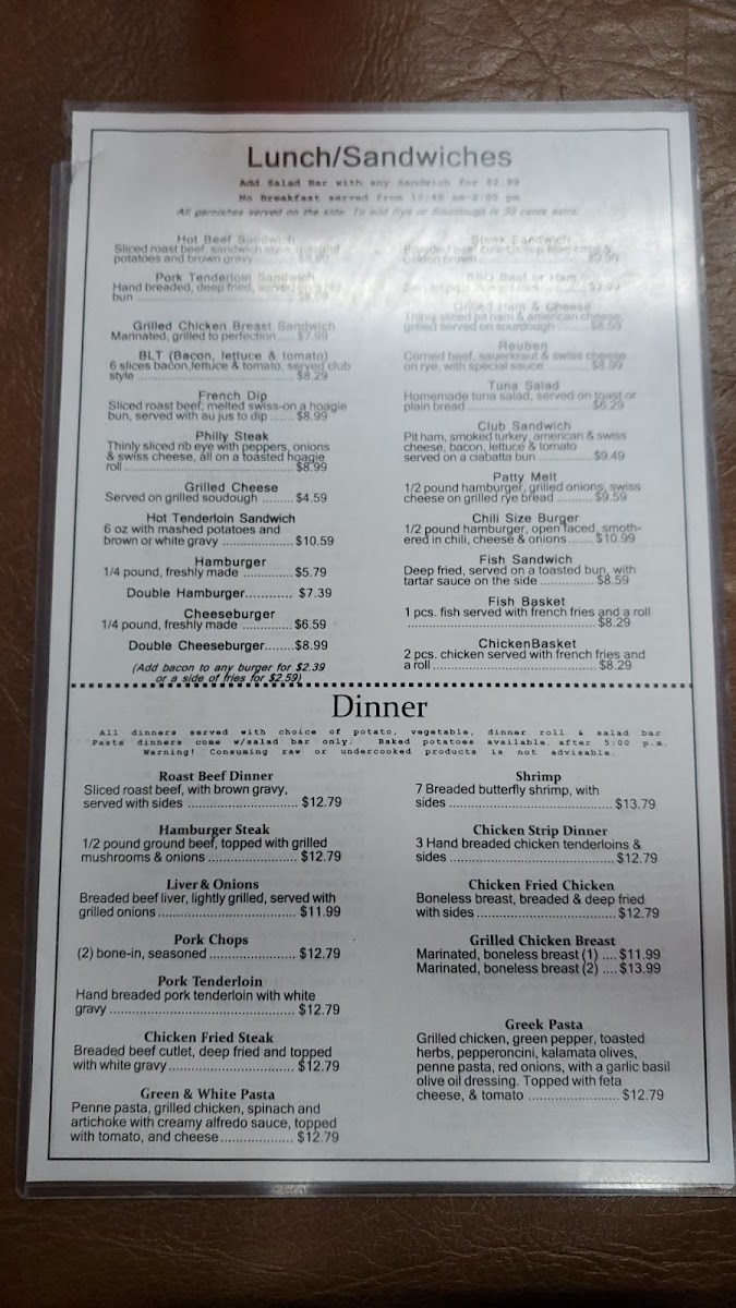 Start your day with familiar favorites like fluffy biscuits and gravy, a two eggs breakfast, or the generous breakfast combo options. For lunch, the menu includes comforting dishes such as country fried steak, chili burgers, and fresh fish and chips. There’s also a welcoming salad bar and lighter choices like grilled chicken salads or tuna plates for those looking for something a bit lighter but still filling.